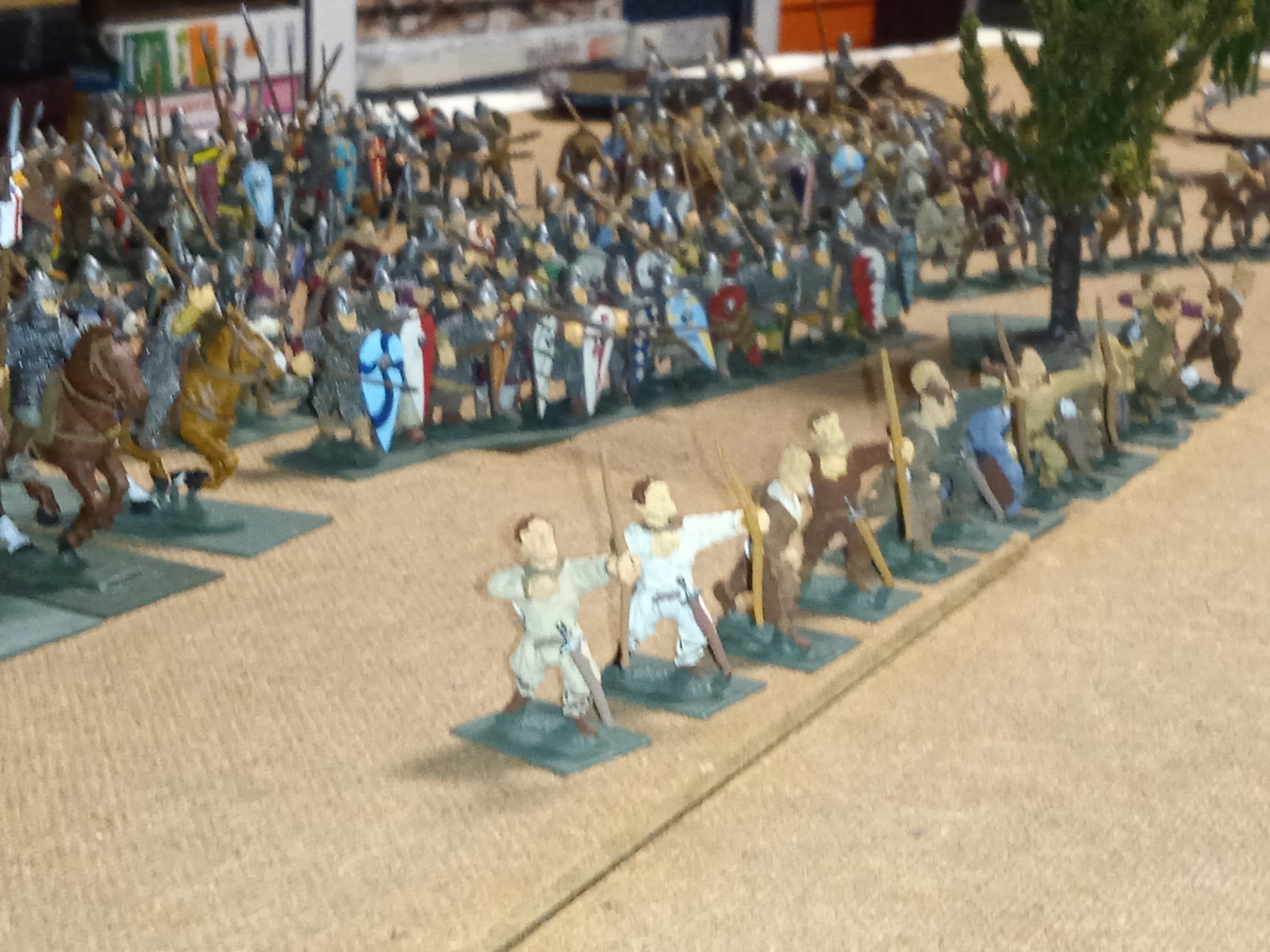 Alla destra i cavalieri franchi avanzano verso il nemico, un’unità dietro l’altra. E sono i balestrieri normanni che, sin da subito, decidono la partita. 12 colpi: i primi quattro falliscono, i successivi 4 eliminano 4 figure(!); gli ultimi 4 solo 1. Conclusione: tolgo ben 5 figure sulle 12 avversarie. Una specie di miracolo.